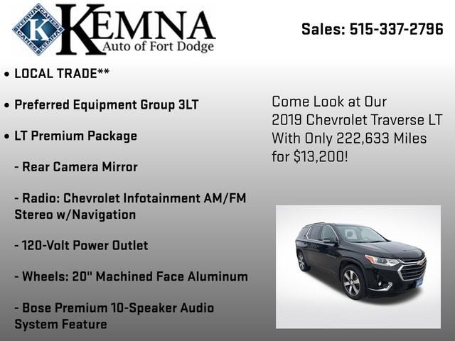Discover the perfect blend of style, capability, and technology in this stunning 2019 Chevrolet Traverse 3LT. With its sleek black exterior and advanced features, this SUV is ready to elevate your driving experience.